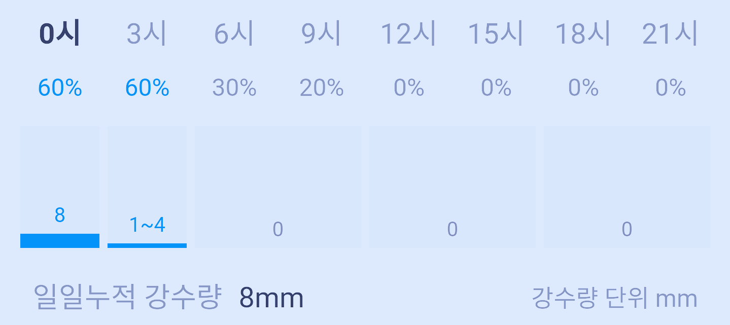 오늘 비 올 확률은 아래 표와 같습니다 어제부터 내린 비가 새벽까지 이어집니다