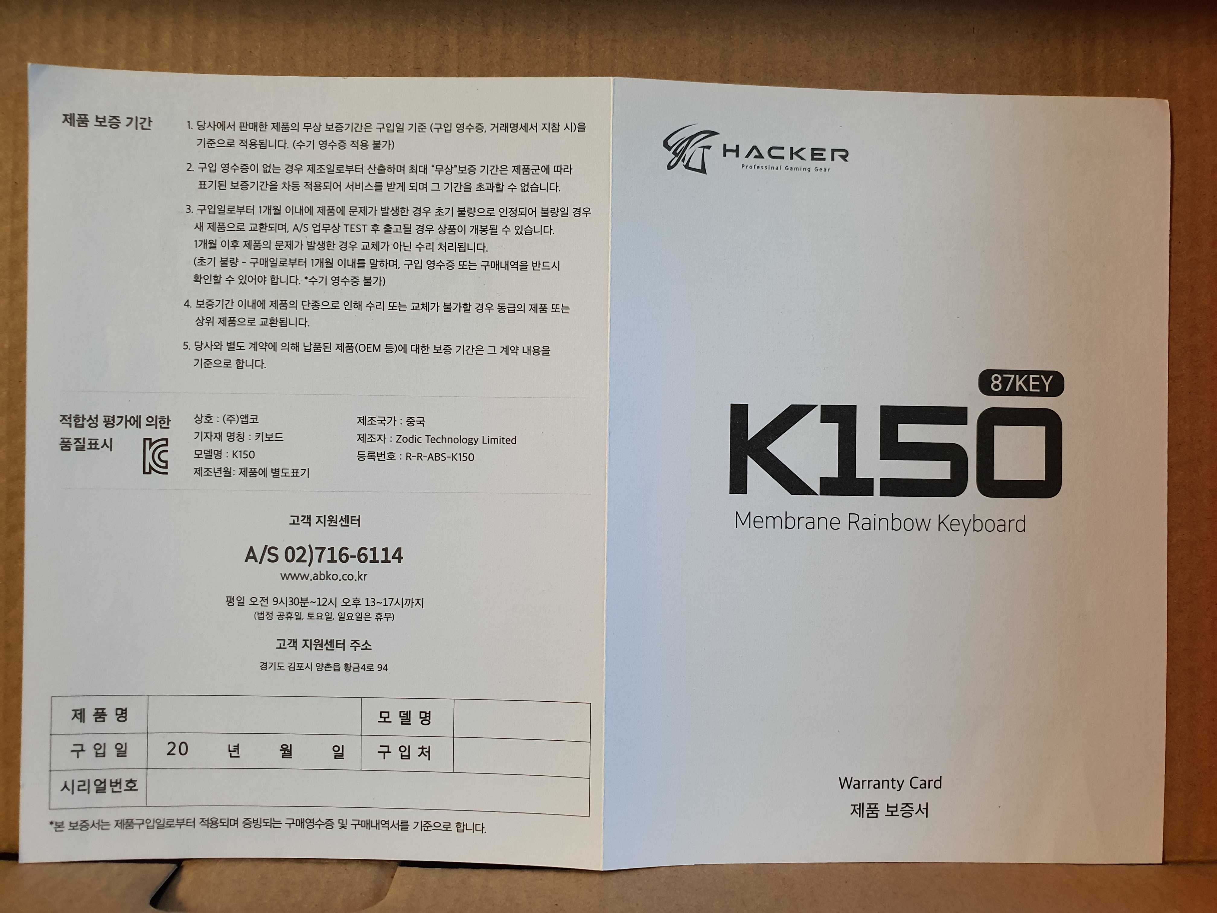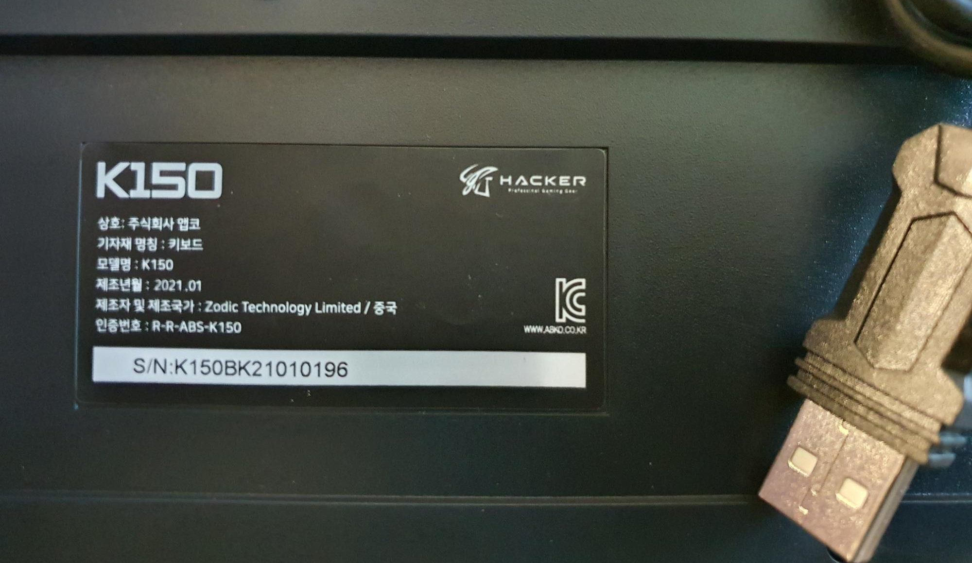 * ABKO Hacker K150 텐키리스 레인보우 LED 게이밍 멤브레인 키보드 뒷면 라벨