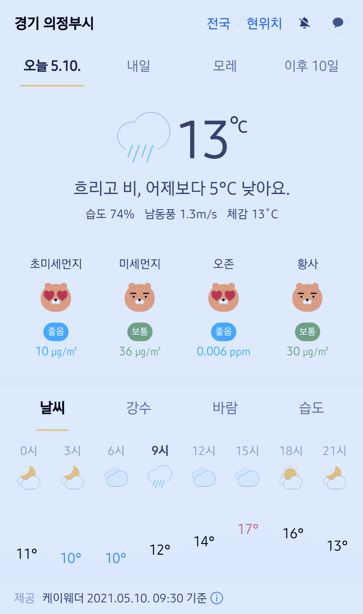 >>>경기도 의정부시 날씨 2021년 5월 10일. 오늘의 날씨, 오늘 날씨, 2021 0510, 초미세먼지, 미세먼지, 황사, 자외선