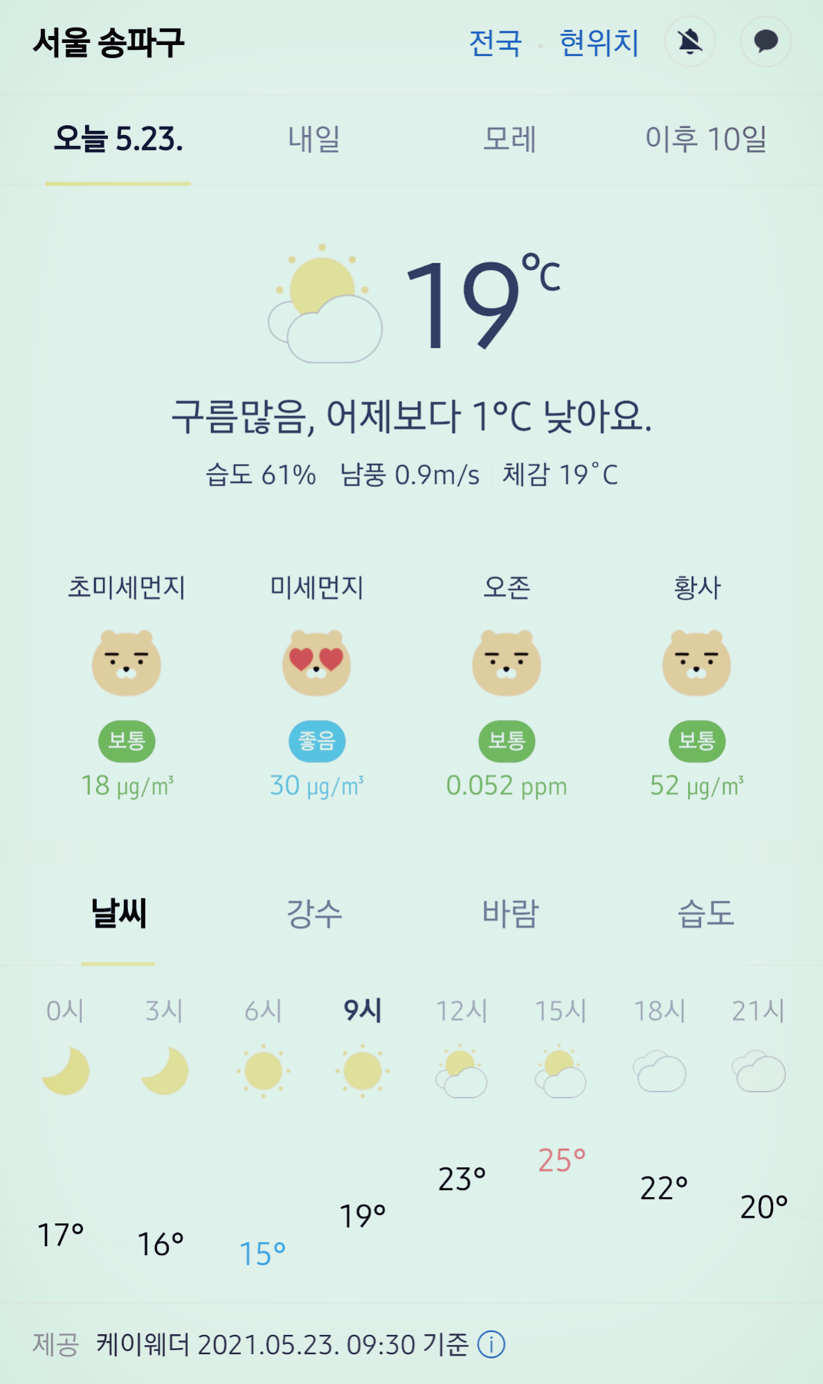 서울 강남 송파구 오늘의 날씨 2021년 5월 23일 (9시 30분 현재)