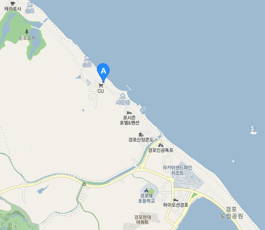 지도 우하단이 강릉 경포도립공원입니다. A로 표시된 곳이 방송에 나온 곰앤패들보드 샵이고, 위아래로 순긋해변 ~ 사근진해변이 펼쳐져 있습니다.