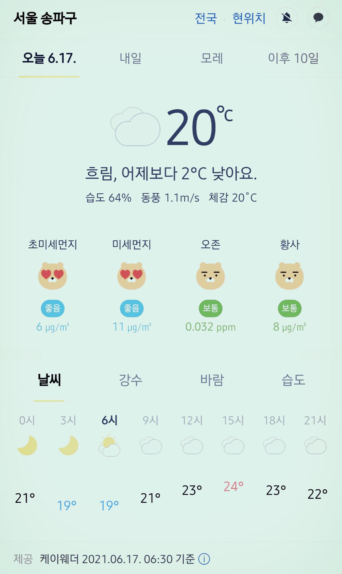 서울 강남 송파구 오늘의 날씨 2021년 6월 17일 (6시 30분 현재)