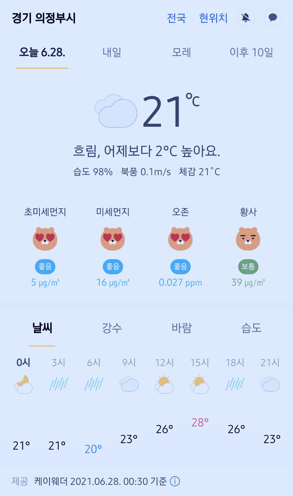 >>>경기도 의정부시 날씨 2021년 6월 28일. 오늘의 날씨, 오늘 날씨, 2021 0628, 초미세먼지, 미세먼지, 황사, 자외선