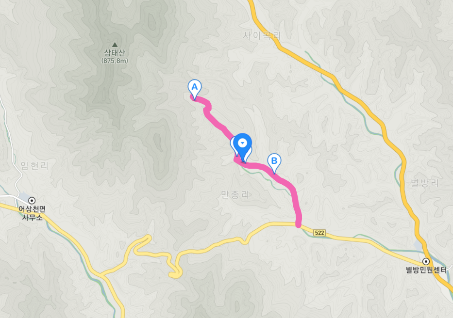 만종리는 삼태산(875m) 주봉의 동측 산자락 계곡에 위치한 산골 마을입니다. 계곡을 따라 만종2길이 이어집니다. 계곡은 사이곡천입니다. 만종리의 계곡 이름이 옆동네 '사이곡리'를 따라 사이곡천입니다.