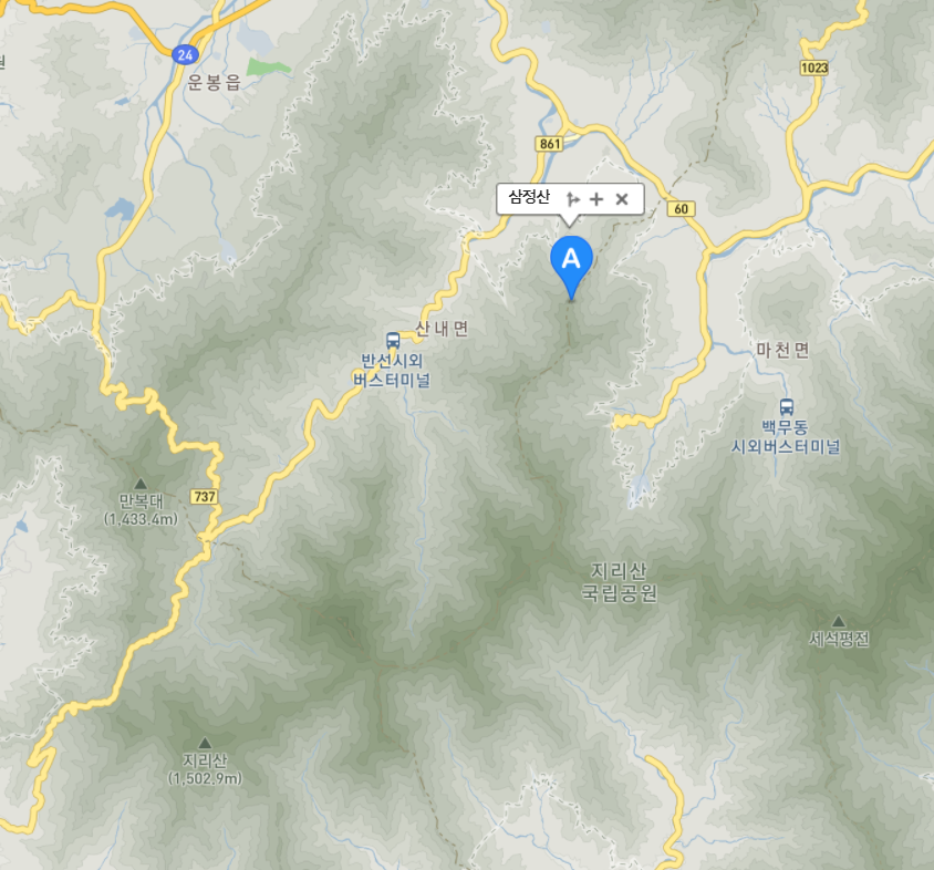아래 지도에서 표시된 곳이 지리산 7암자 순례길의 사찰과 암자들의 중심이 되는 지리산 삼정산입니다.