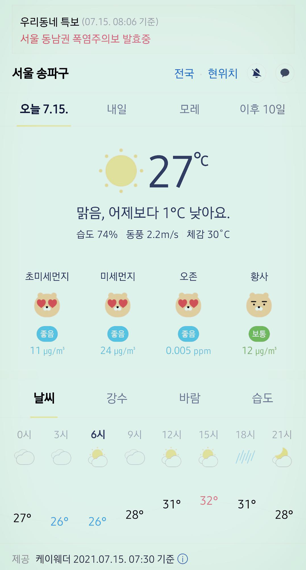 >>>서울 강남 송파구 날씨 2021년 7월 15일. 서울 강남구 오늘의 날씨, 폭염주의보 발효중, 오늘 날씨, 2021 0715, 초미세먼지, 미세먼지, 황사, 자외선