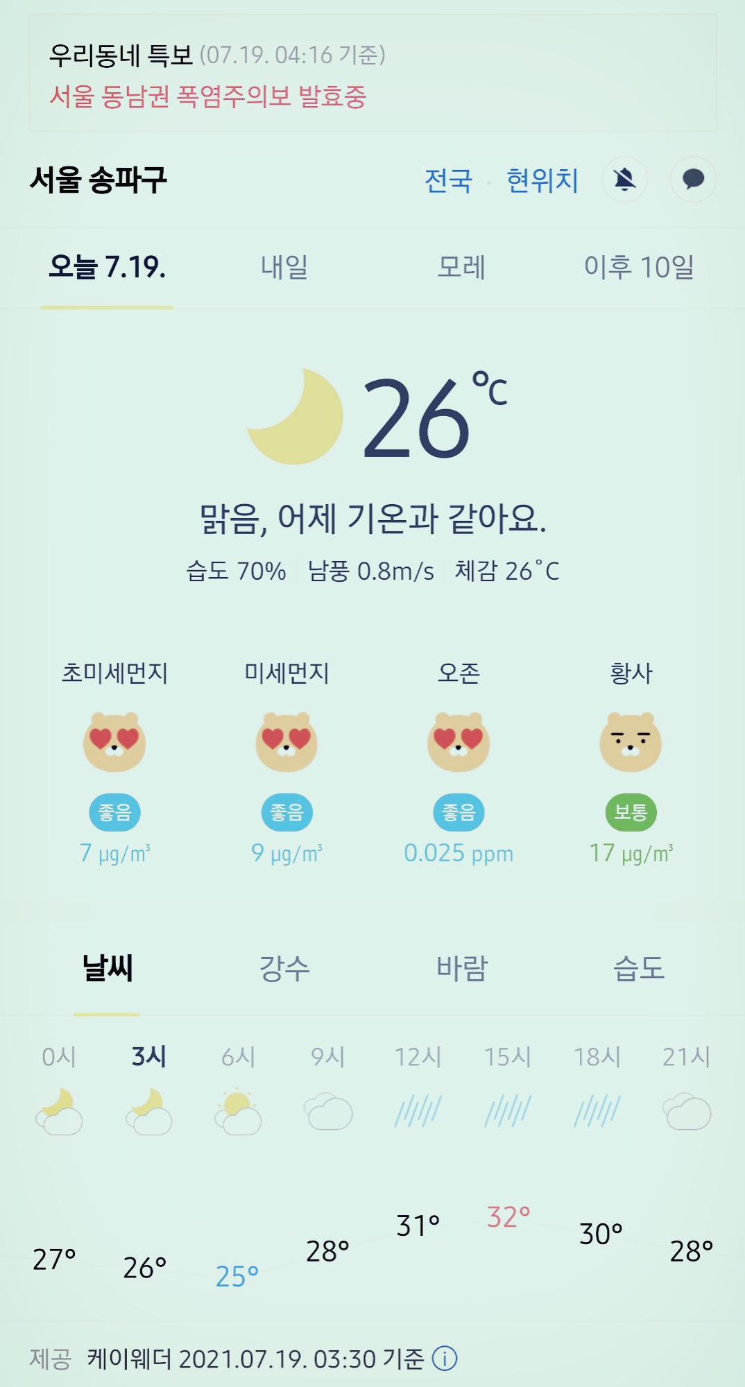 서울 강남 송파구 오늘의 날씨 2021년 7월 19일 (3시 30분 현재)