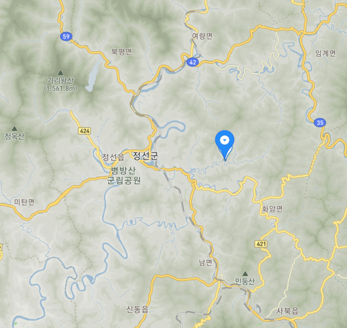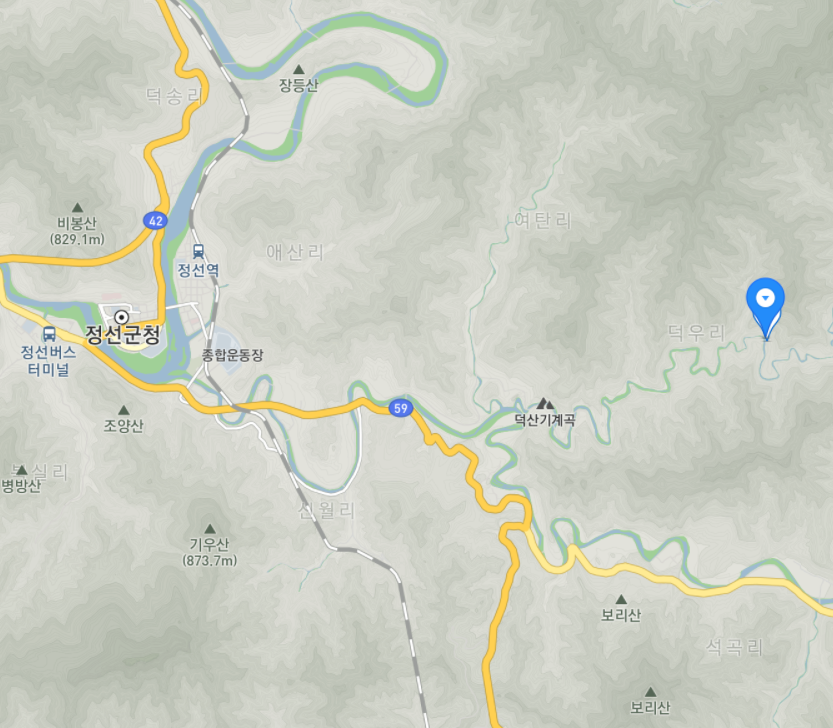 아래 지도에서 표시된 곳이 강원도 정선군 덕산기 계곡에 위치한 게스트하우스 덕산터입니다.