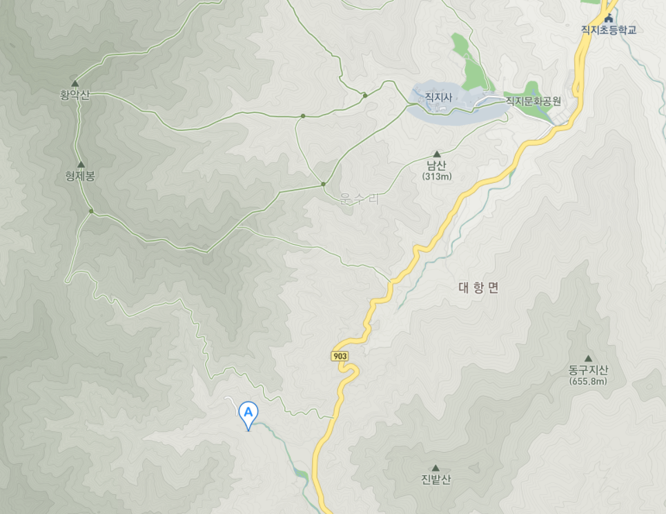 지도 상단 좌측에 황악산 주봉이 보입니다. '자연이숨쉬는집' 요양원은 황악산 - 형제봉 봉우리와 능선의 남동쪽 산자락에 위치합니다.
