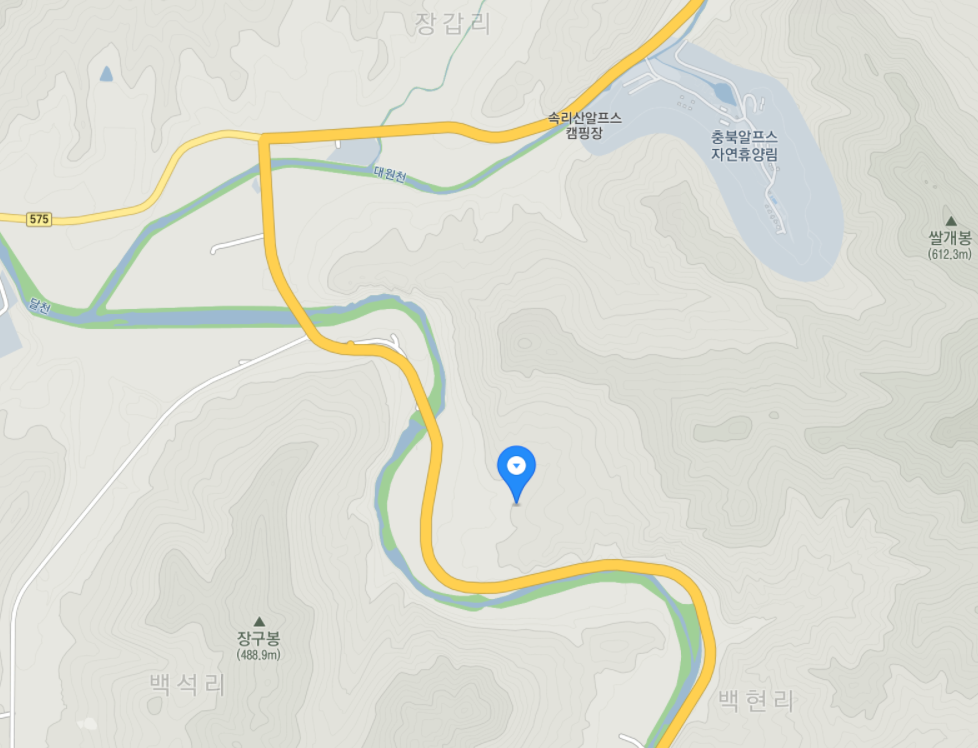 지도 상단에 가로로 흐르는 물길은 대원천이고 세로로 흐르는 물길은 달천입니다. 대원천과 달천 옆을 따라 난 (지도 상의 짙은 노랑색) 길이 속리산로입니다.