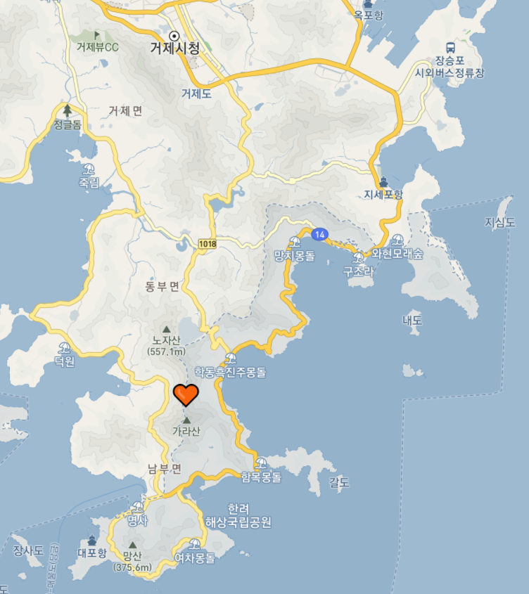 아래 지도에서 표시된 곳이 경남 거제시 남부면 가라산입니다.