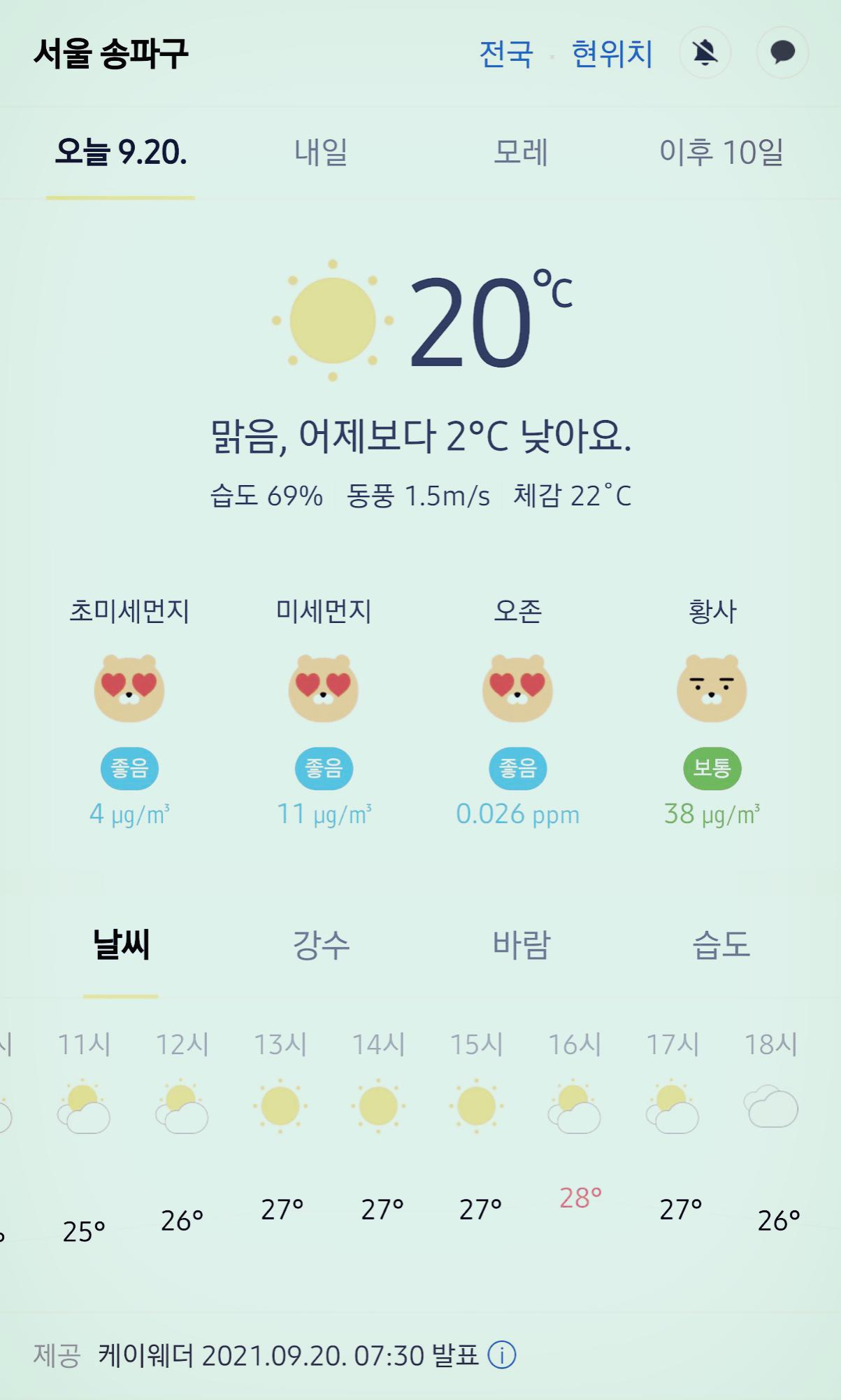 서울 강남 송파구 오늘의 날씨 2021년 9월 20일 (07시 30분 현재)