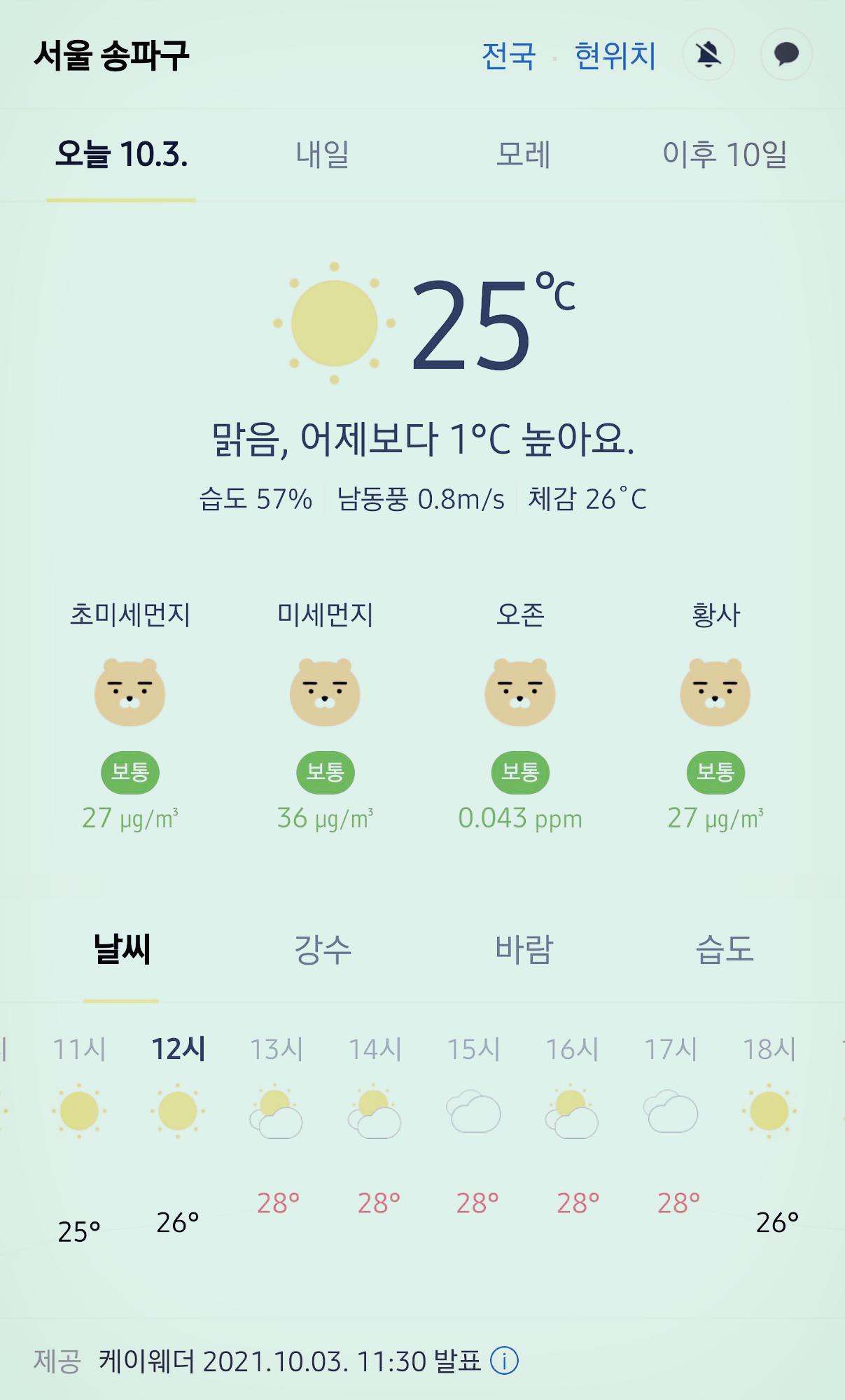 서울 강남 송파구 오늘의 날씨 2021년 10월 3일 (11시 30분 현재)