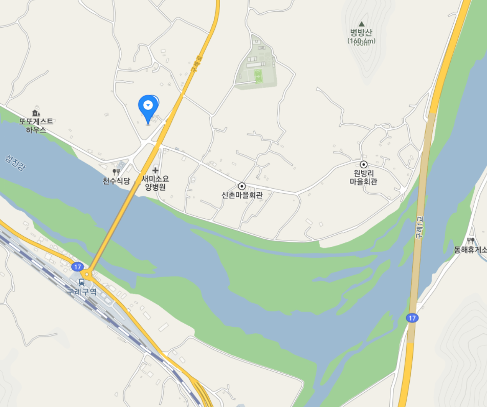 지도의 물길은 섬진강입니다. 섬진강을 건너는 다리는 왼쪽이 구례구역 앞으로 들어가는 구례교, 오른쪽이 구례1교입니다.