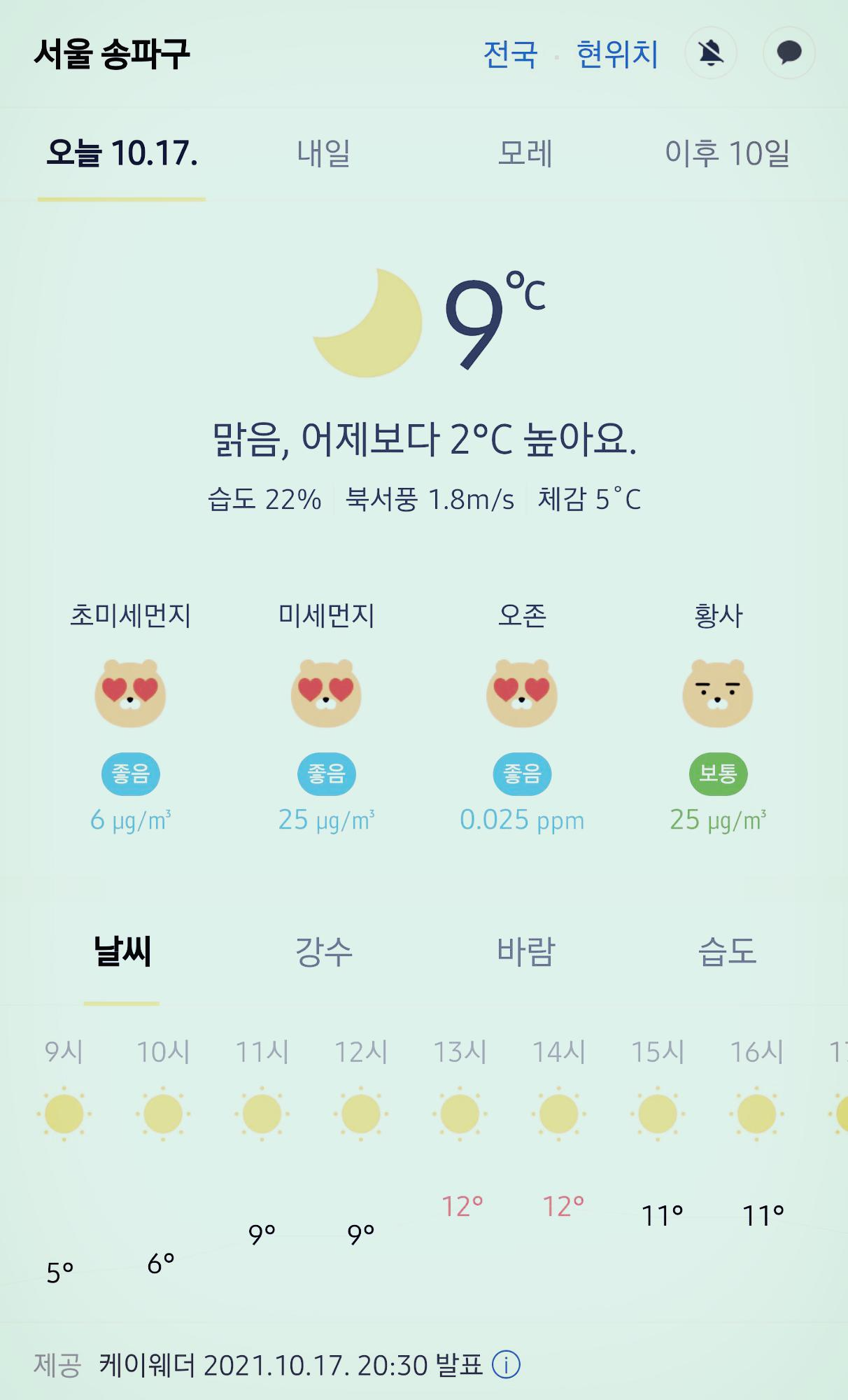 서울 강남 송파구 오늘의 날씨 2021년 10월 17일 (20시 30분 현재)