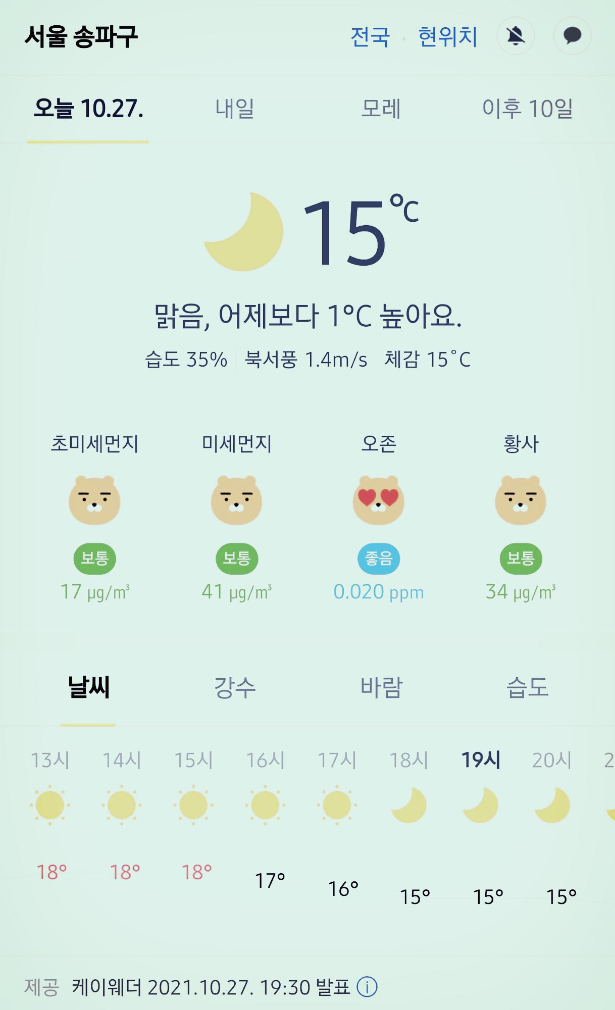 서울 강남 송파구 오늘의 날씨 2021년 10월 27일 (19시 30분 현재)