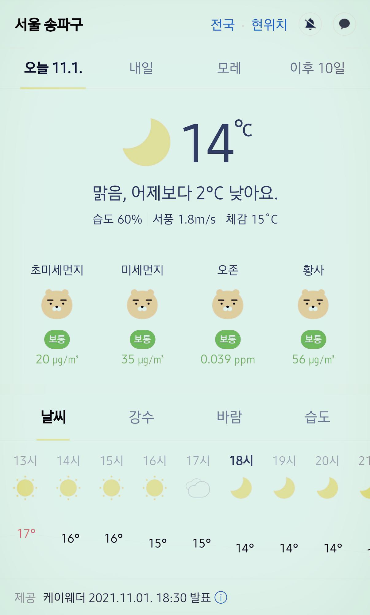 서울 강남 송파구 오늘의 날씨 2021년 11월 1일 (18시 30분 현재)