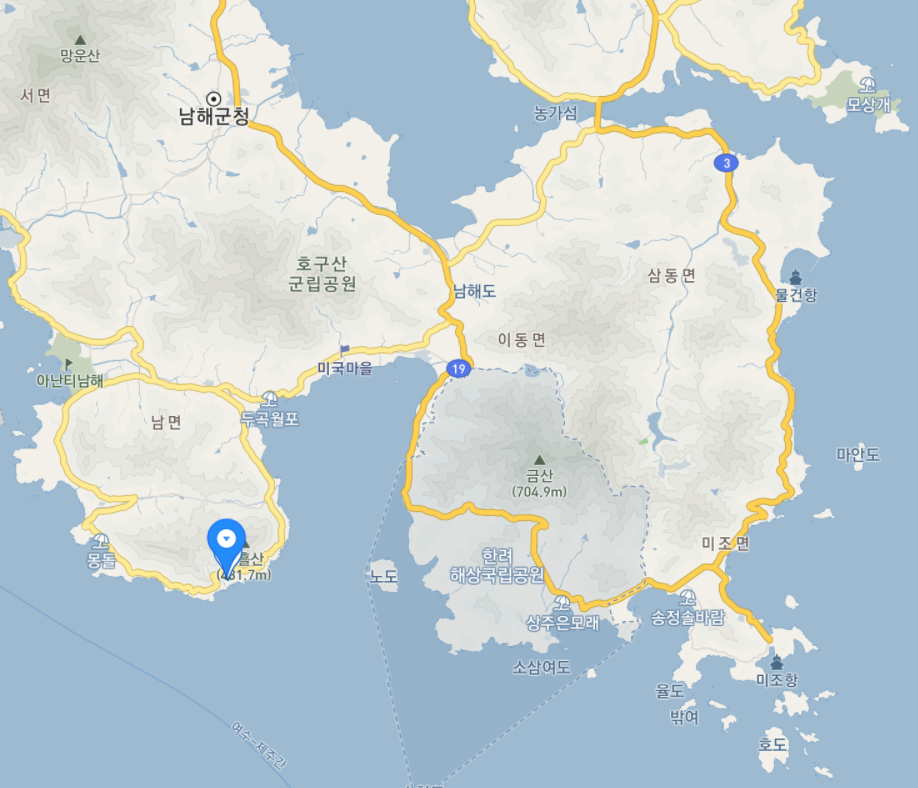 지도 상단 좌측에 남해군청이 위치합니다. 남해군청에서 다랭이마을 고기덕 송순영 씨 부부의 카페 톨까지는 도로 기준으로 23km 정도 거리입니다. 호구산 군립공원을 끼고 돌아 남해도 쪽으로 우회해서 접근합니다.