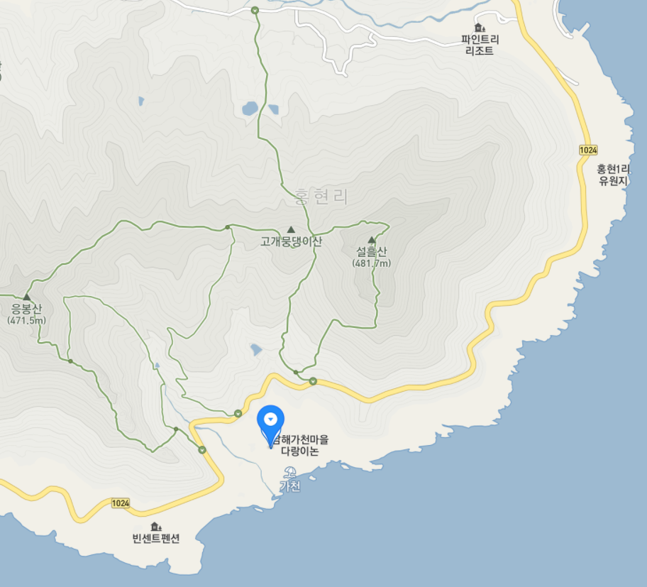지도 우측에 매체에 자주 소개되어 역시나 유명한 남해 '홍현1리 유원지'가 위치하고 있습니다. 바로 옆에 (역시나 유명한) 홍현리 해라우지 마을이 위치합니다.
