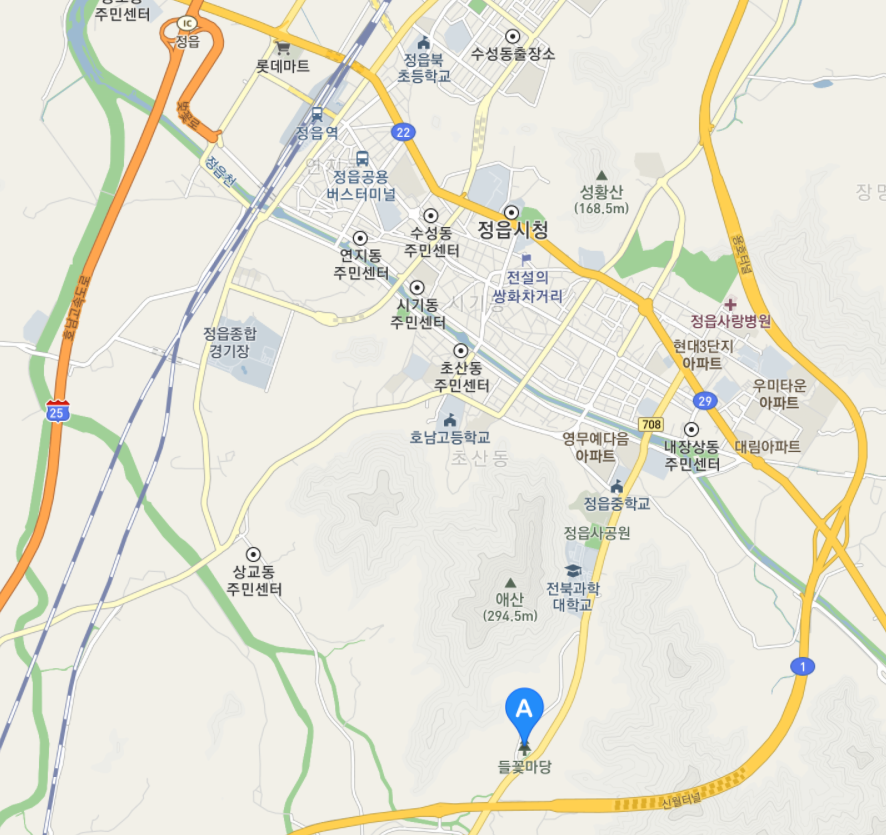 지도 중앙 상단에 정읍시청이 위치합니다. 정읍시청에서 전천만 나경숙 씨 부부의 정읍 들꽃마당까지는 도로 기준으로 5km 정도 거리입니다.