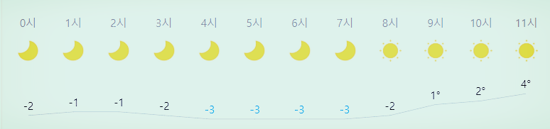 최저기온 -1도(오전), -2도(밤), 최고기온 2도(낮)
