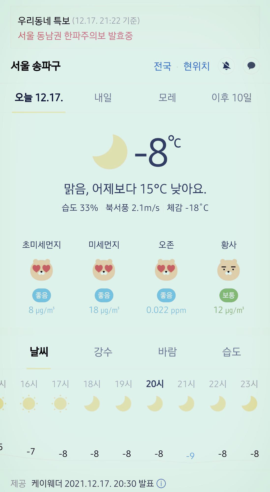 서울 강남 송파구 오늘의 날씨 2021년 12월 17일 (20시 30분 현재)