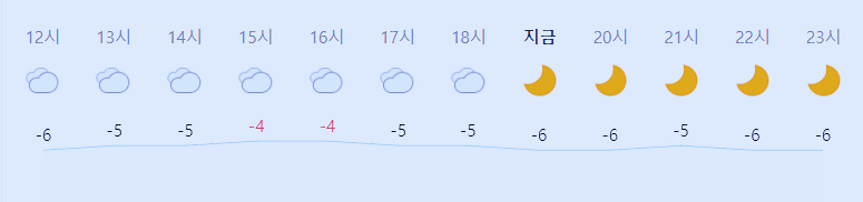 최저기온 -15도(오전), -6도(밤), 최고기온 -4도(낮)