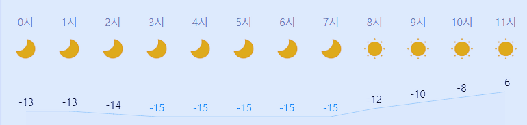 최저기온 -16도(오전), -13도(밤), 최고기온 -8도(낮)