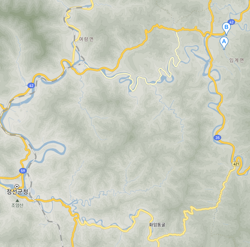 지도 좌측 하단에 정선군청이 위치합니다. 정선군청에서 임계면 장찬골 입구까지는 도로 기준으로 37km 거리입니다.