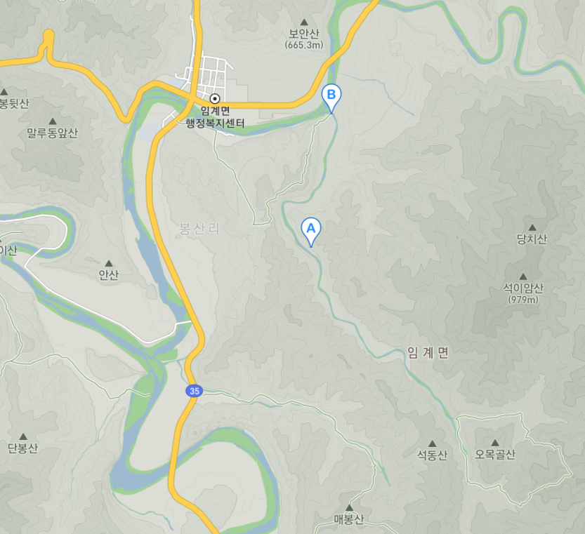 지도 상단의 물길은 임계천이고 지도 하단의 물길은 골지천입니다. 임계천은 임계면 행정복지센터를 지나 골지천과 합류합니다.