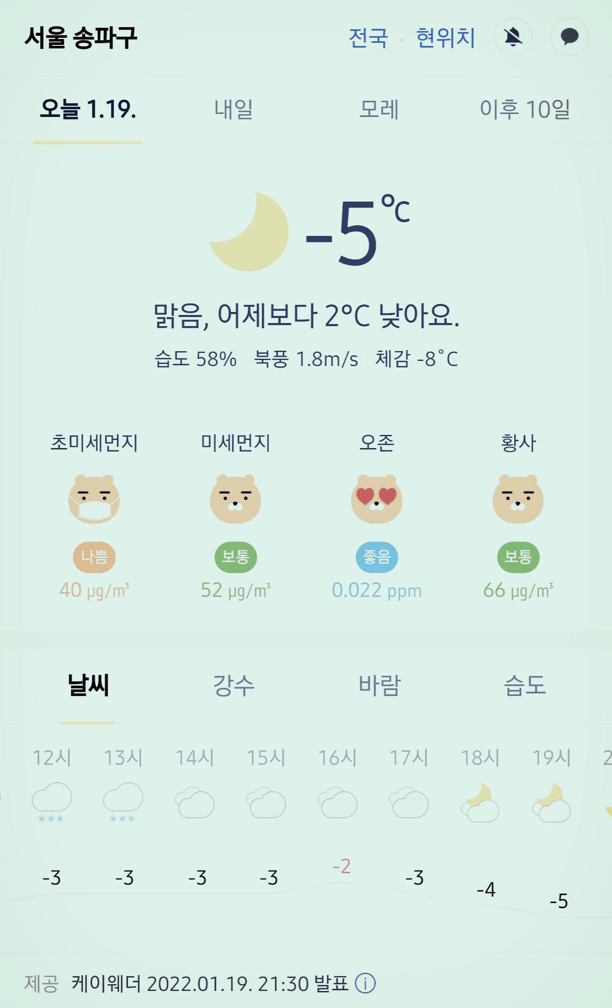 서울 강남 송파구 오늘의 날씨 2022년 1월 19일 (21시 30분 현재)