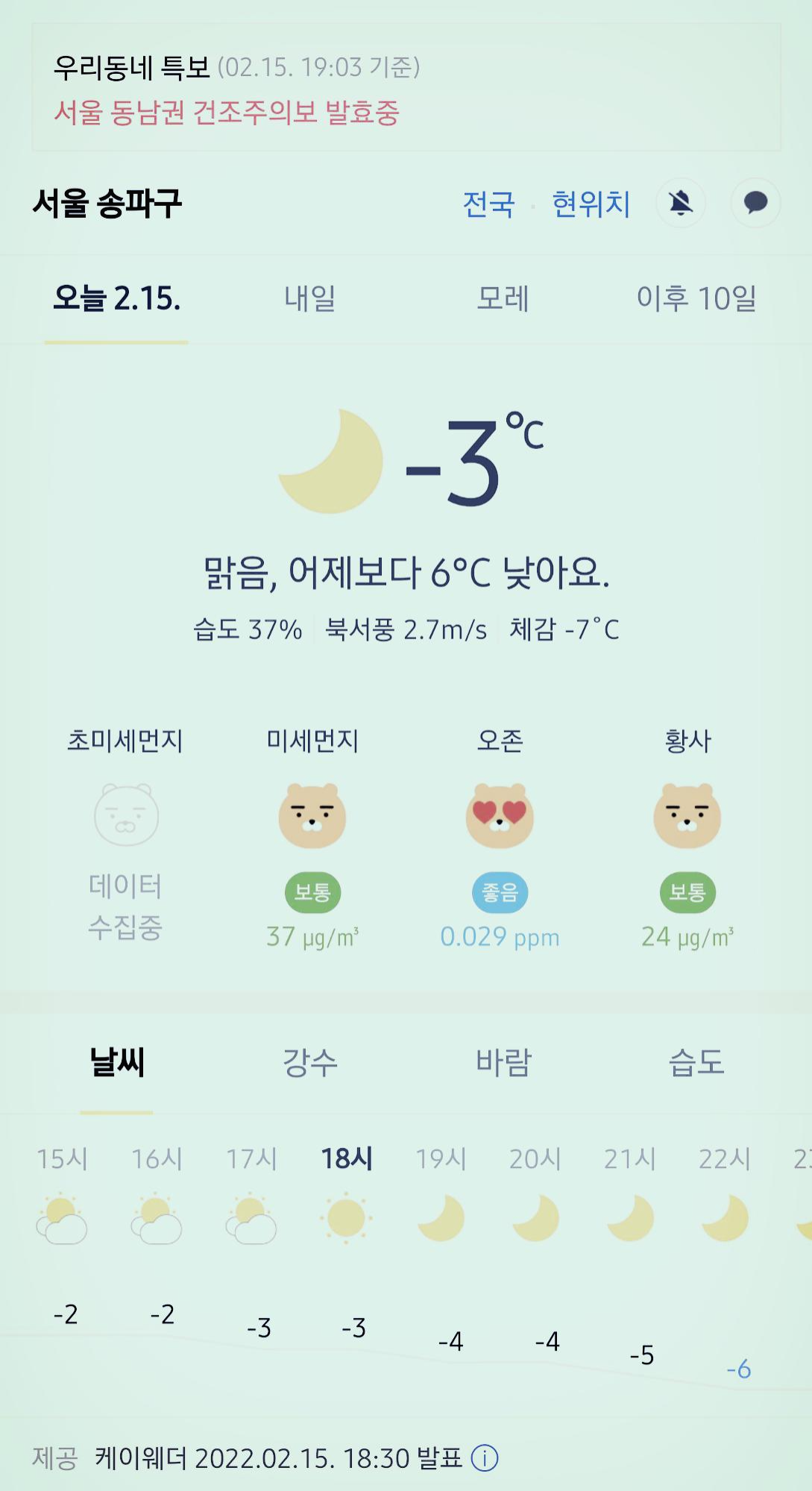 서울 강남 송파구 오늘의 날씨 2022년 2월 15일 (18시 30분 현재)