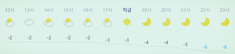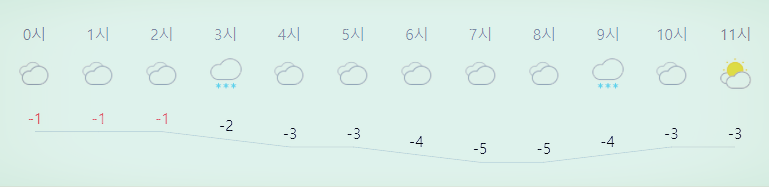 최저기온 -5도(오전), -6도(밤), 최고기온 -1도(새벽), -2도(낮)