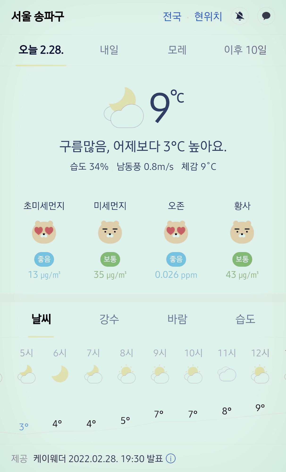 서울 강남 송파구 오늘의 날씨 2022년 2월 28일 (19시 30분 현재)
