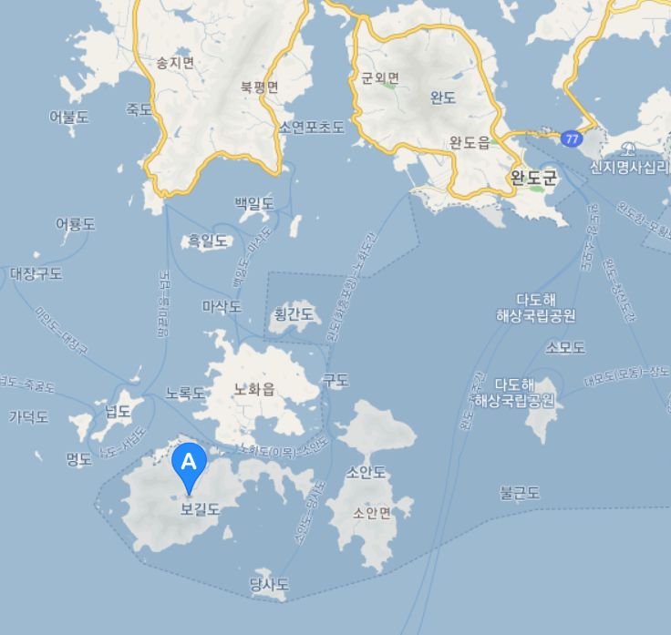 지도에서 보듯 보길도, 노화도, 소안도가 비교적 큰 섬으로 한 데 모여 있습니다. 지도 우측의 소안도는 아직 노화도와 연결되지 않았는데요. 노화도 ~ 구도 ~ 소안도를 연결하는 방식으로 대교 공사가 예정되어 있다고 합니다. 노화도와 구도는 연결되어 있는 상태고요(2017년 완공). 보길도와 소안도를 연결한다는 얘기는 들리지 않고 있고요.