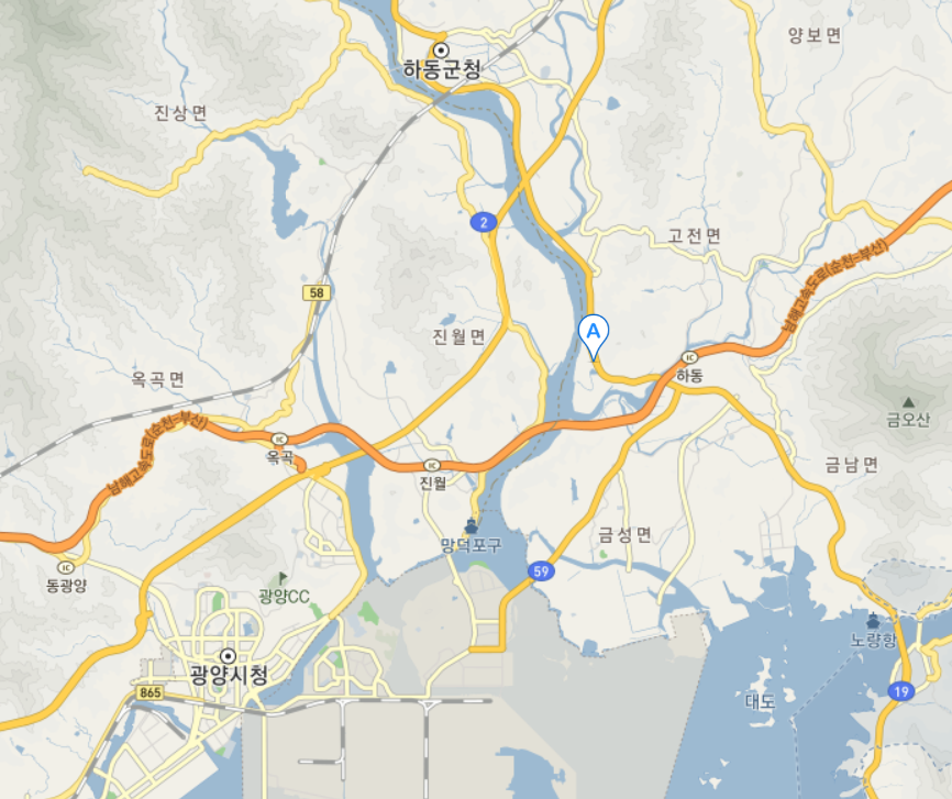 지도 상의 하동군에서 섬진강 건너편은 광양시가 됩니다. 전라남도죠. 광양시에서 조금 더 북으로 올라가면 구례군입니다. 섬진강 변에 하동군 광양시 구례군이 위치하고 있습니다.