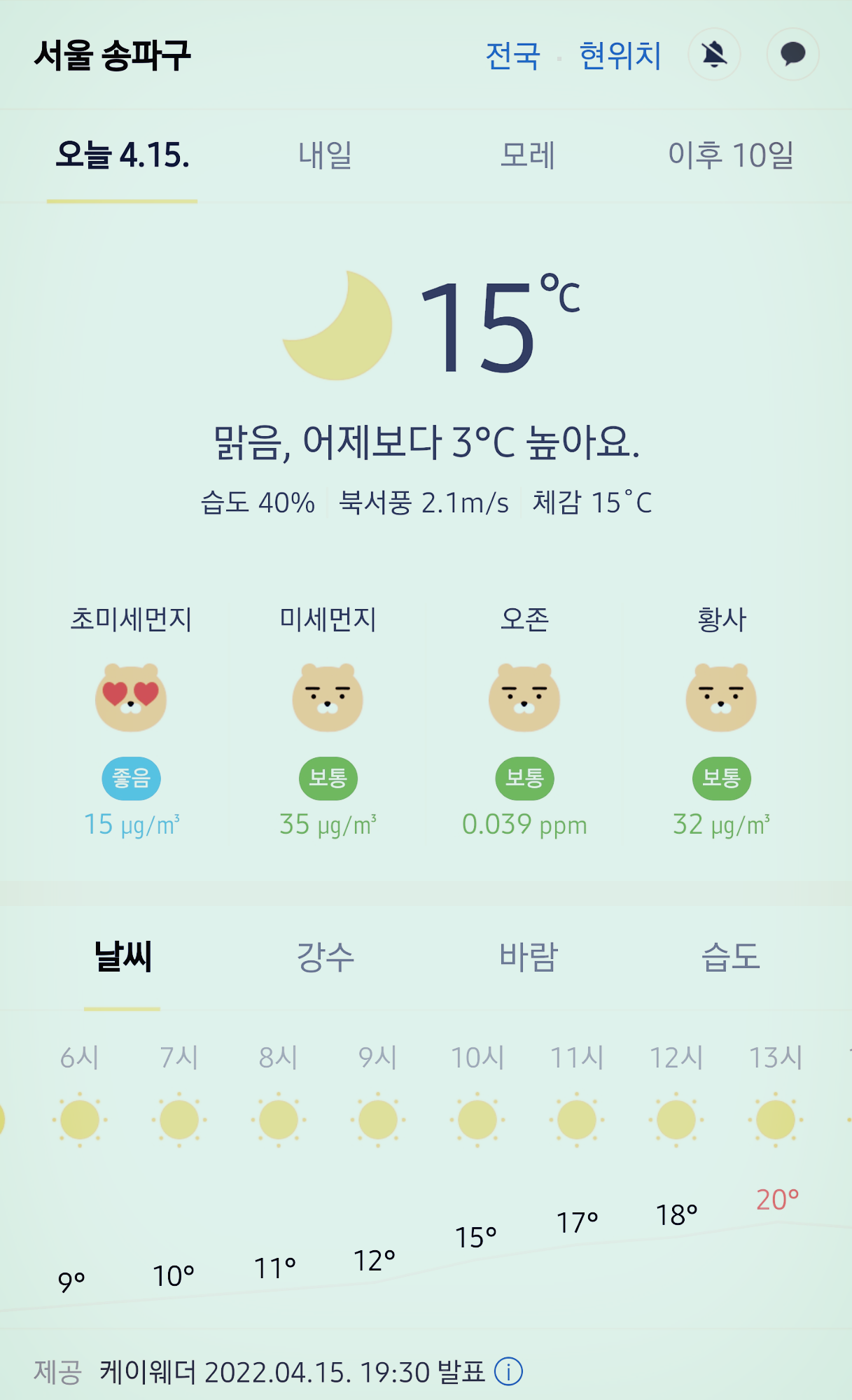 서울 강남 송파구 오늘의 날씨 2022년 4월 15일 (19시 30분 현재)
