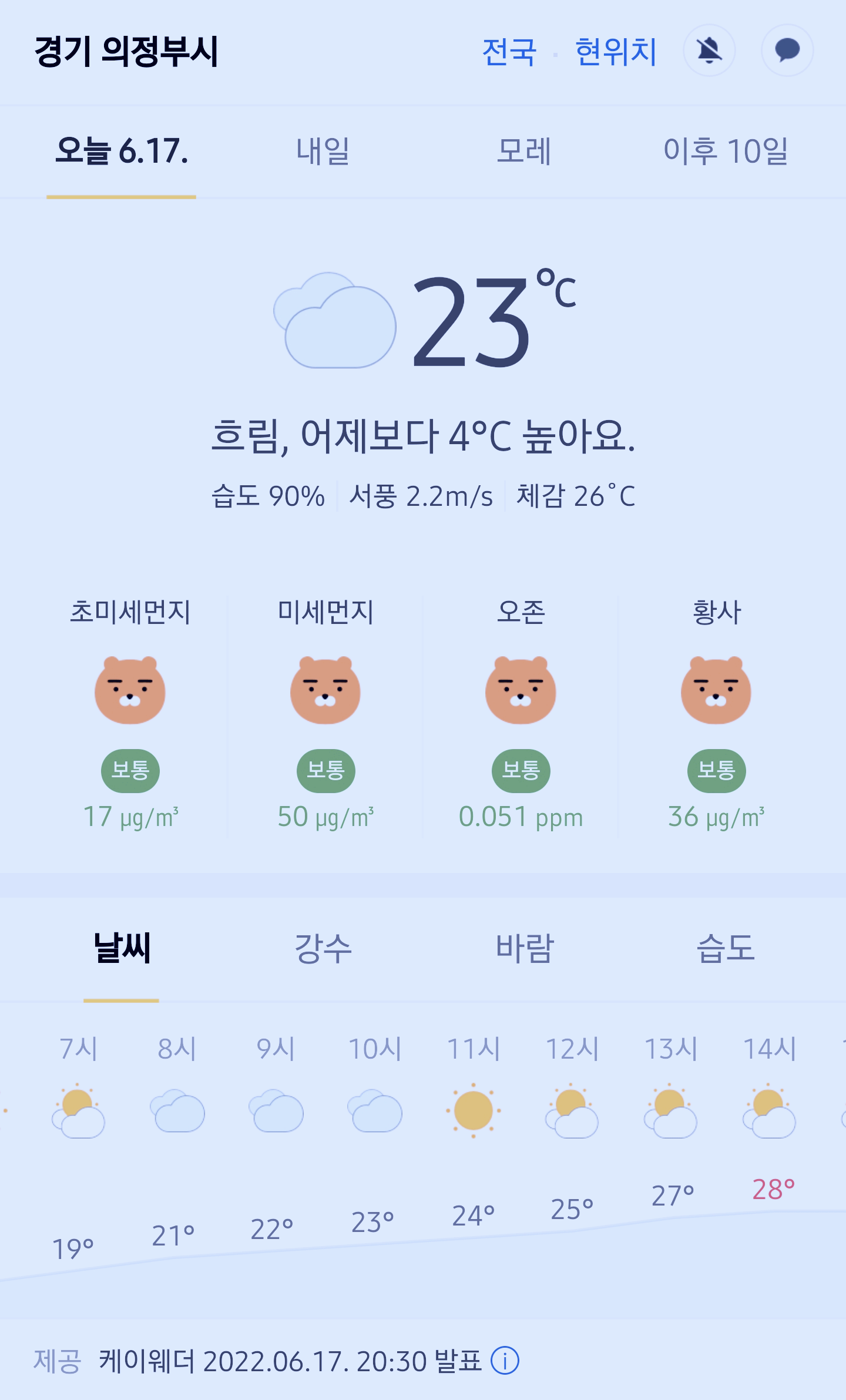 >>>경기도 의정부시 날씨 2022년 6월 17일. 의정부 날씨, 오늘의 날씨, 오늘 날씨, 2022 0617, 초미세먼지, 미세먼지, 황사, 자외선
