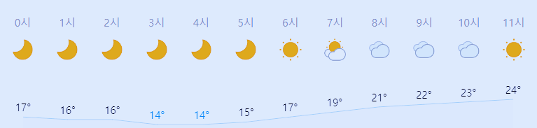 최저기온 17도(오전, 밤), 최고기온 24도(낮)