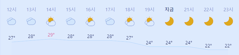 어제와 같은 최저기온, 어제보다 5도 높은 최고기온입니다 아침에 최저기온 영상 22도이고 낮 최고기온 영상 29도입니다 오전 0시 - 4시 최저기온, 오후 14시 최고기온이네요