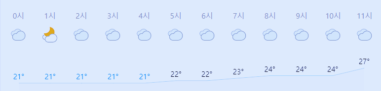 최저기온 21도(오전, 심야), 최고기온 24도(오전, 낮)