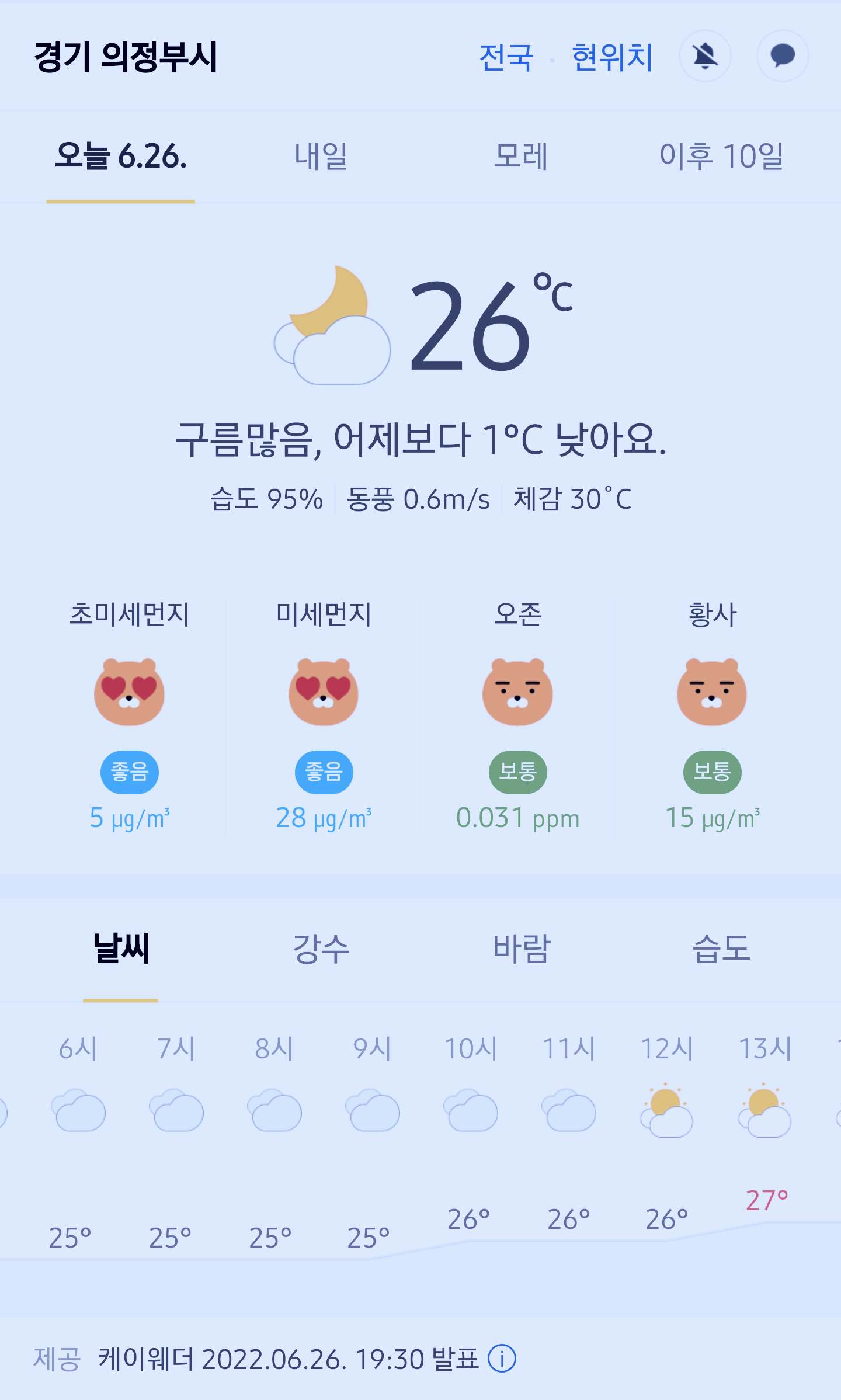 >>>경기도 의정부시 날씨 2022년 6월 26일. 의정부 날씨, 오늘의 날씨, 오늘 날씨, 2022 0626, 초미세먼지, 미세먼지, 황사, 자외선