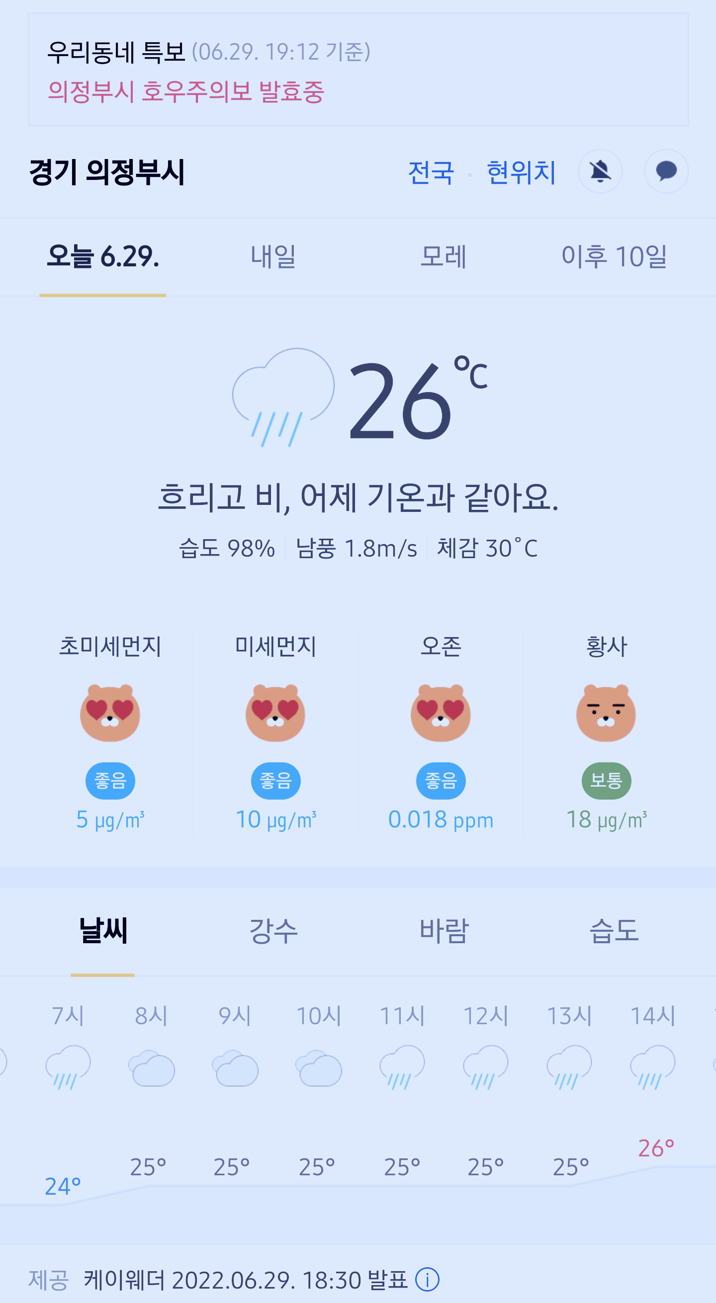 경기도 의정부시 날씨, 경기도 의정부시 오늘의 날씨, 의정부 오늘 날씨, 호우주의보 발효중, 오늘의 날씨, 오늘 날씨, 2022 0629, 초미세먼지, 미세먼지, 황사, 자외선