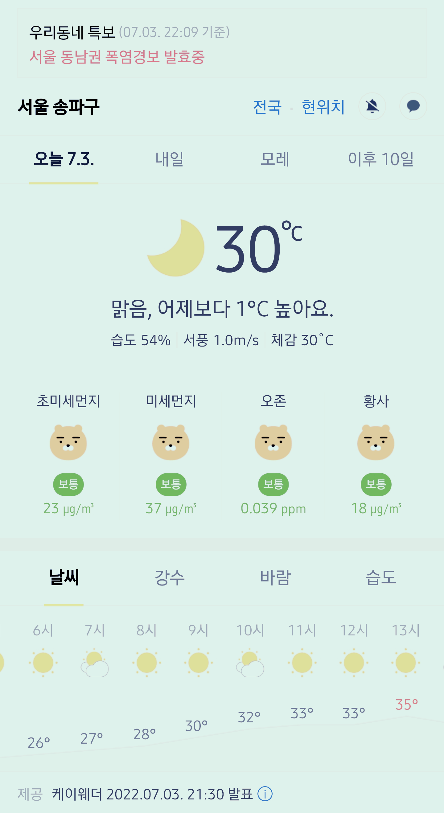 >>>서울 강남 송파구 날씨 2022년 7월 3일. 서울 강남구 오늘의 날씨, 폭염경보 발효중, 오늘 날씨, 2022 0703, 초미세먼지, 미세먼지, 황사, 자외선