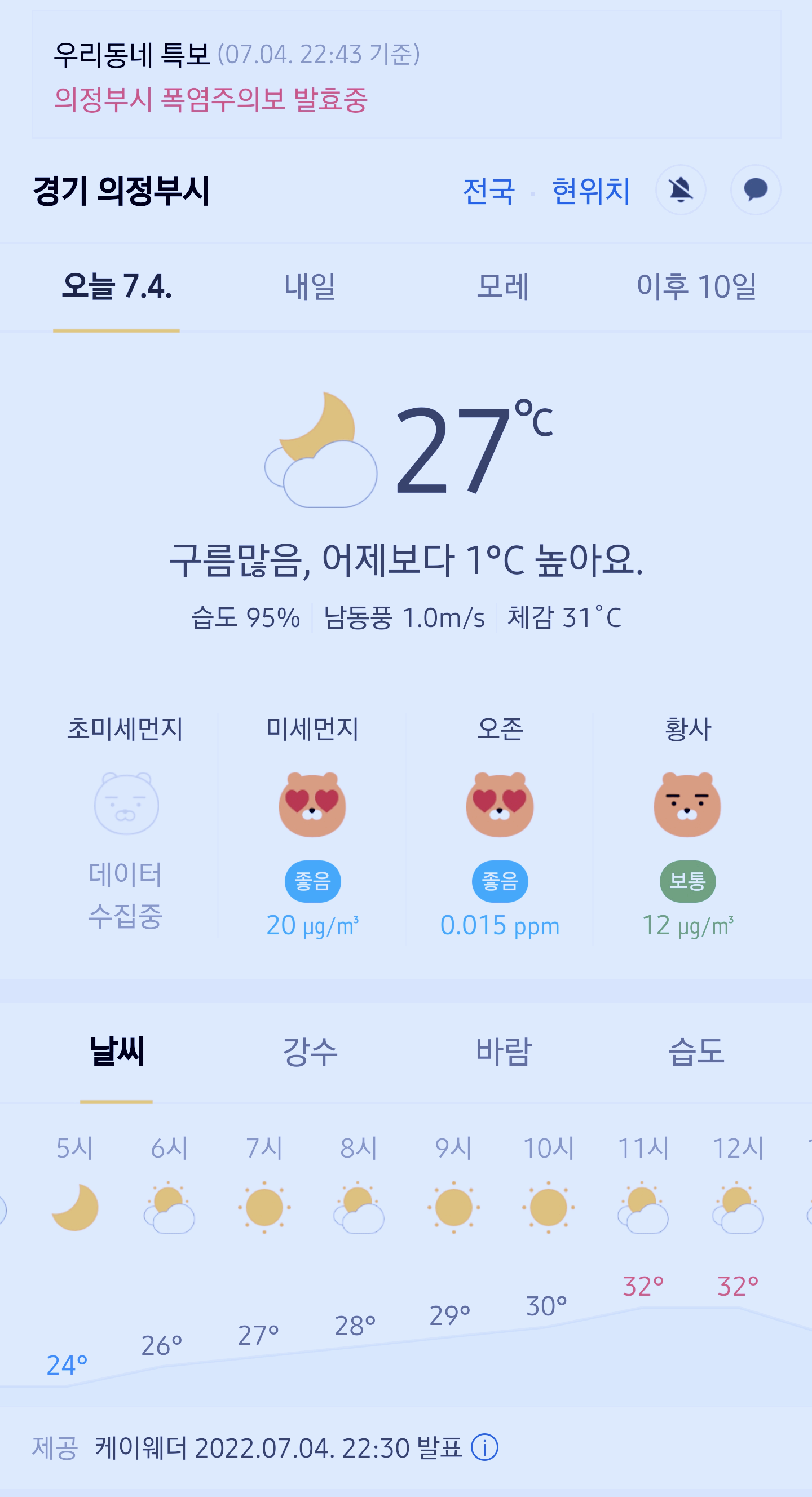 경기도 의정부시 오늘의 날씨 2022년 7월 4일 (22시 30분 현재)
