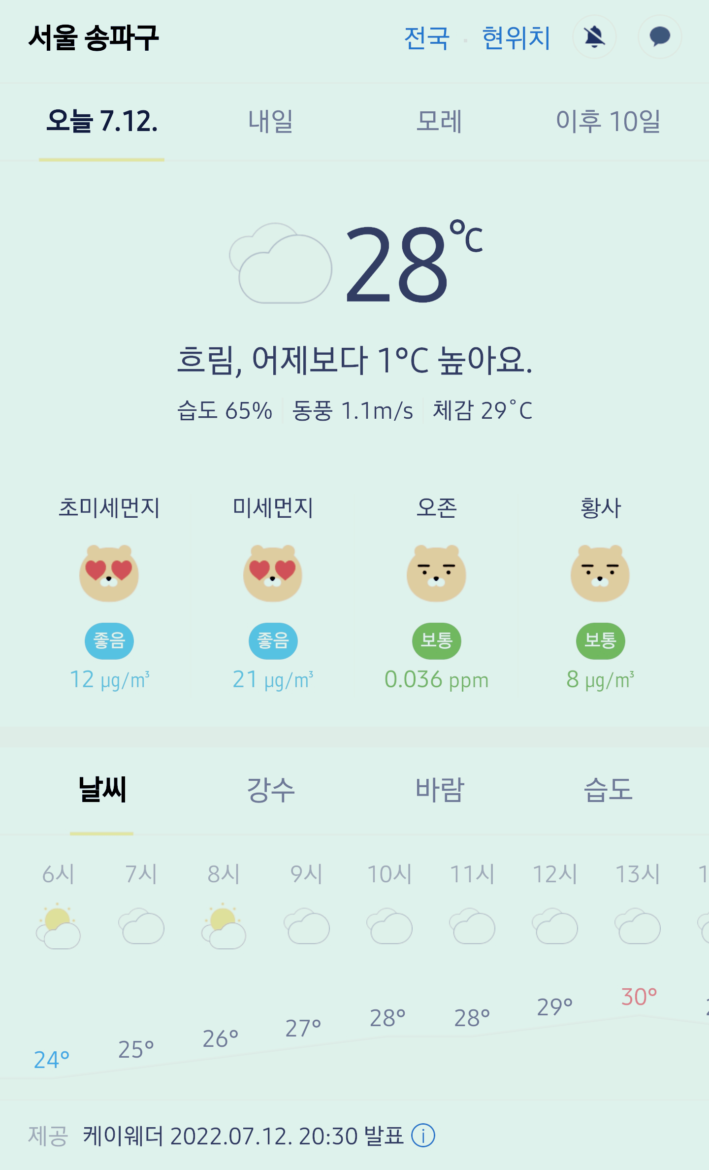 >>>서울 강남 송파구 날씨 2022년 7월 12일. 서울 강남구 오늘의 날씨, 오늘 날씨, 2022 0712, 초미세먼지, 미세먼지, 황사, 자외선