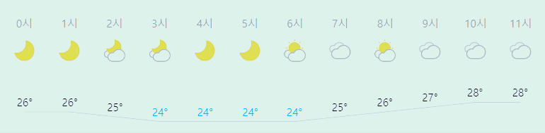 어제보다 1도 낮은 최저기온, 어제보다 1도 낮은 최고기온입니다 아침에 최저기온 영상 24도이고 낮 최고기온 영상 30도입니다 새벽 3시 - 6시 최저기온이고 오후 13시 최고기온입니다