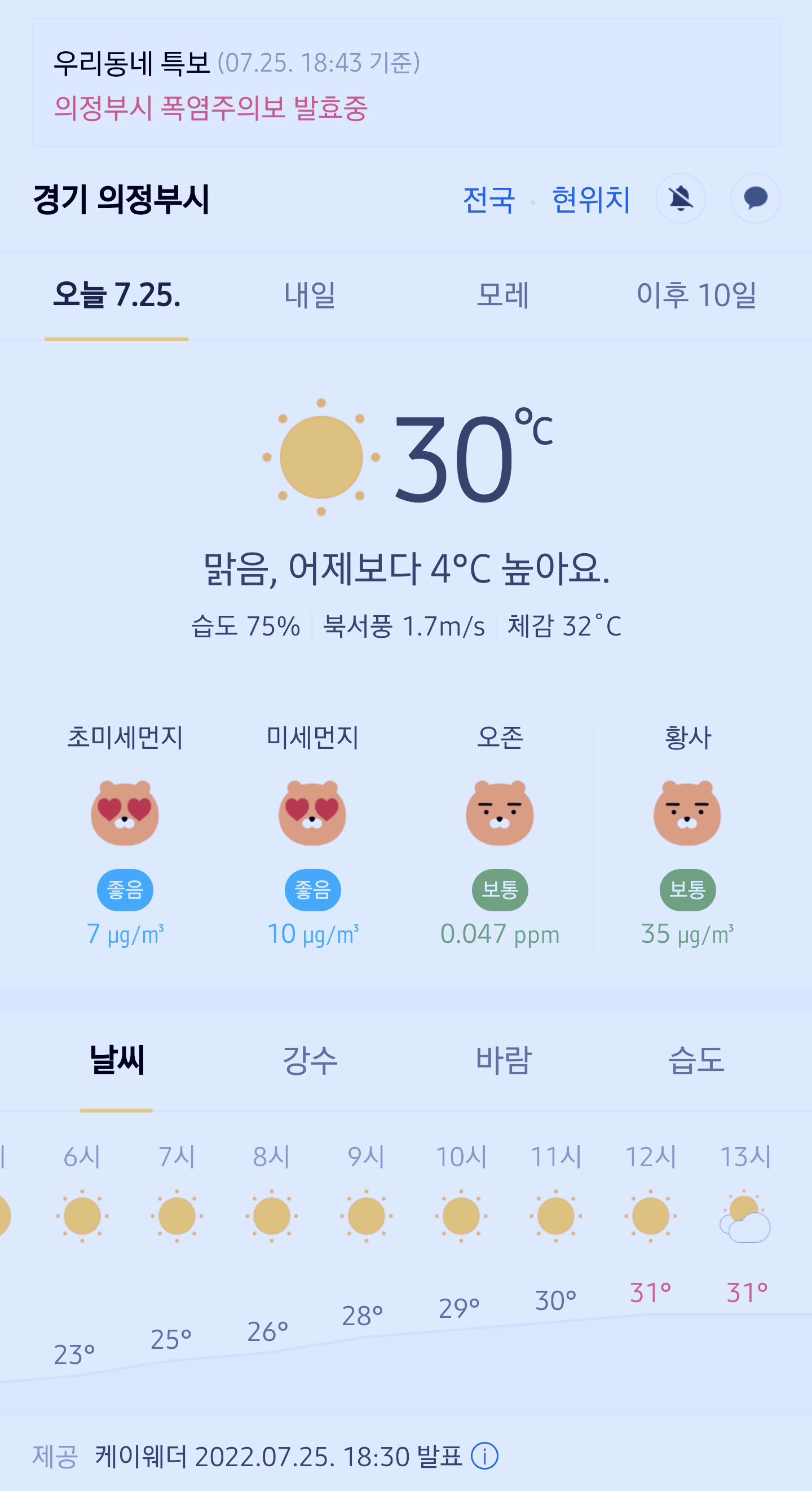 >>>경기도 의정부시 날씨 2022년 7월 25일. 의정부 날씨, 폭염주의보 발효중, 오늘의 날씨, 오늘 날씨, 2022 0725, 초미세먼지, 미세먼지, 황사, 자외선