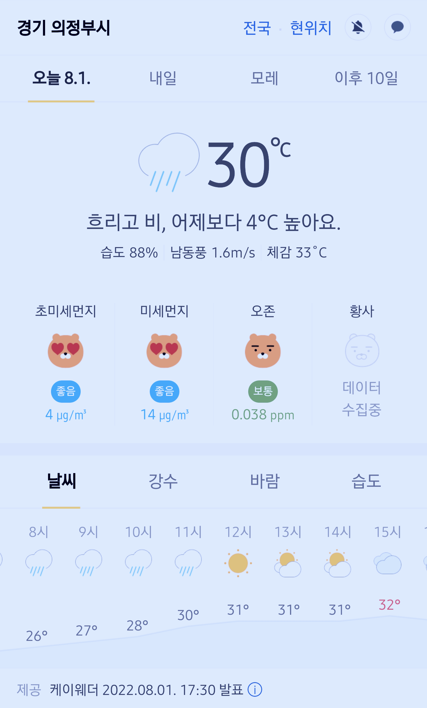 >>>경기도 의정부시 날씨 2022년 8월 1일. 의정부 날씨, 오늘의 날씨, 오늘 날씨, 2022 0801, 초미세먼지, 미세먼지, 황사, 자외선