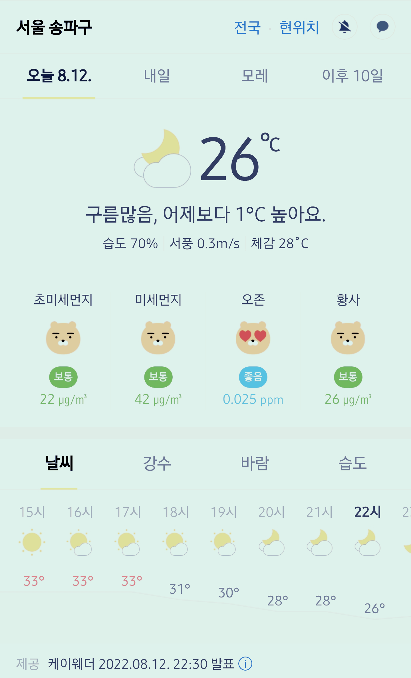 서울 강남 송파구 오늘의 날씨 2022년 8월 12일 (22시 30분 현재)